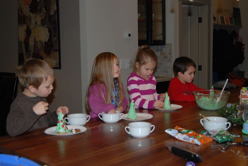 What simple and fun activity! We turned sugar cones upside down, frosted them green and then let the kids add decorations. So glad that Anna and Logan could join us for the fun.